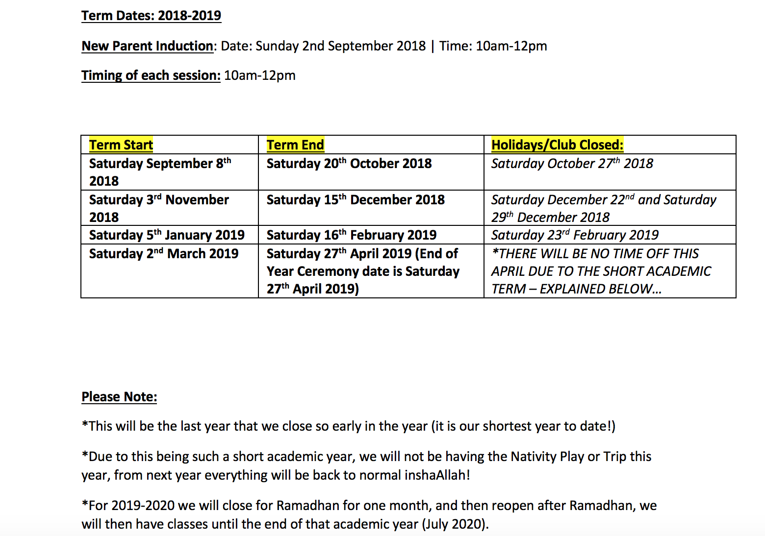 The dates set out above are the confirmed term and holiday dates for the year 2018 - 2019. Term Dates: 2018-2019 New Parent Induction: Date: Sunday 2nd September 2018 | Time: 10am-12pm Timing of each session: 10am-12pm